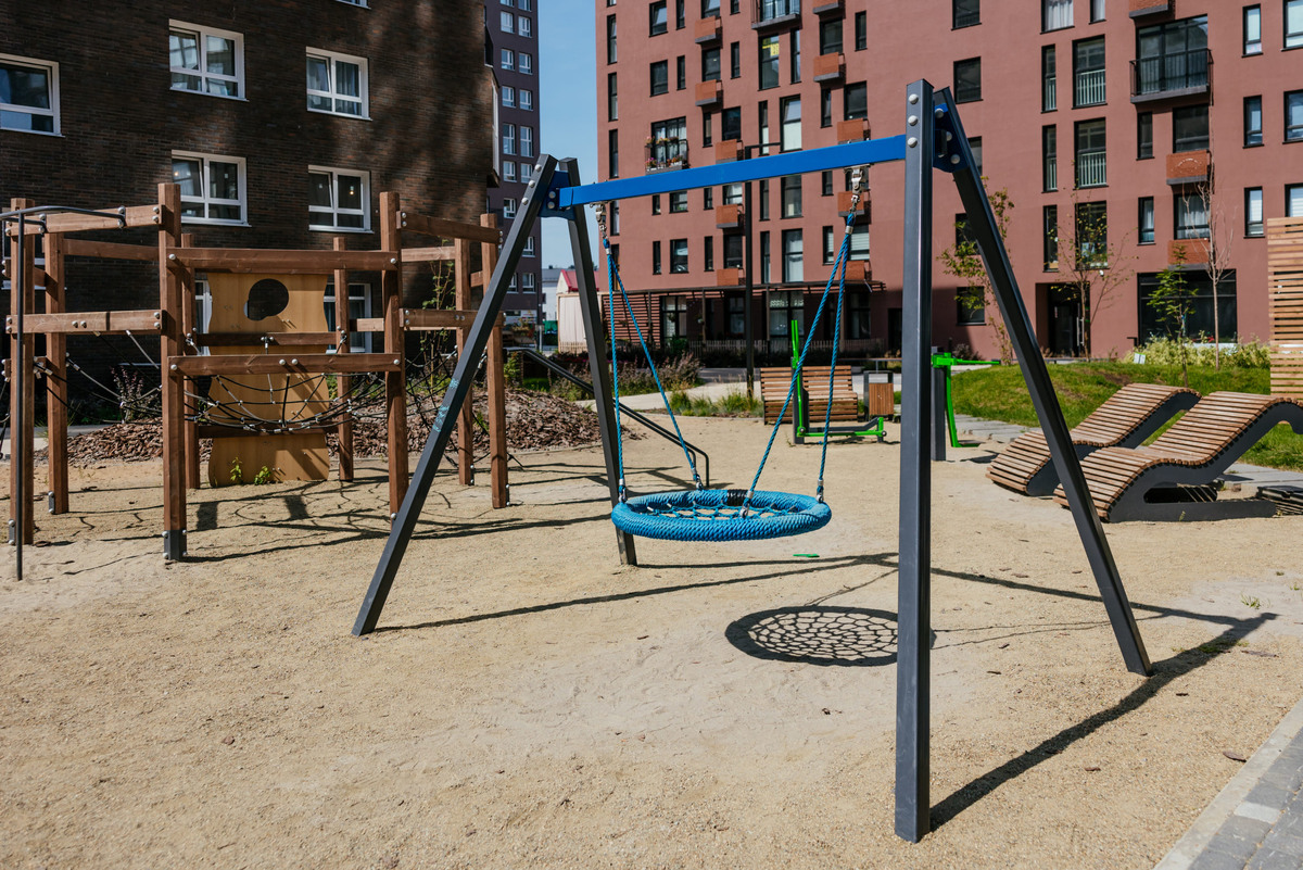 - Групповые качели («Гнездо», паутина): Вмещают несколько детей. Требуют усиленной рамы и большей зоны безопасности. Популярный выбор, чтобы приобрести для новой площадки в ЖК.