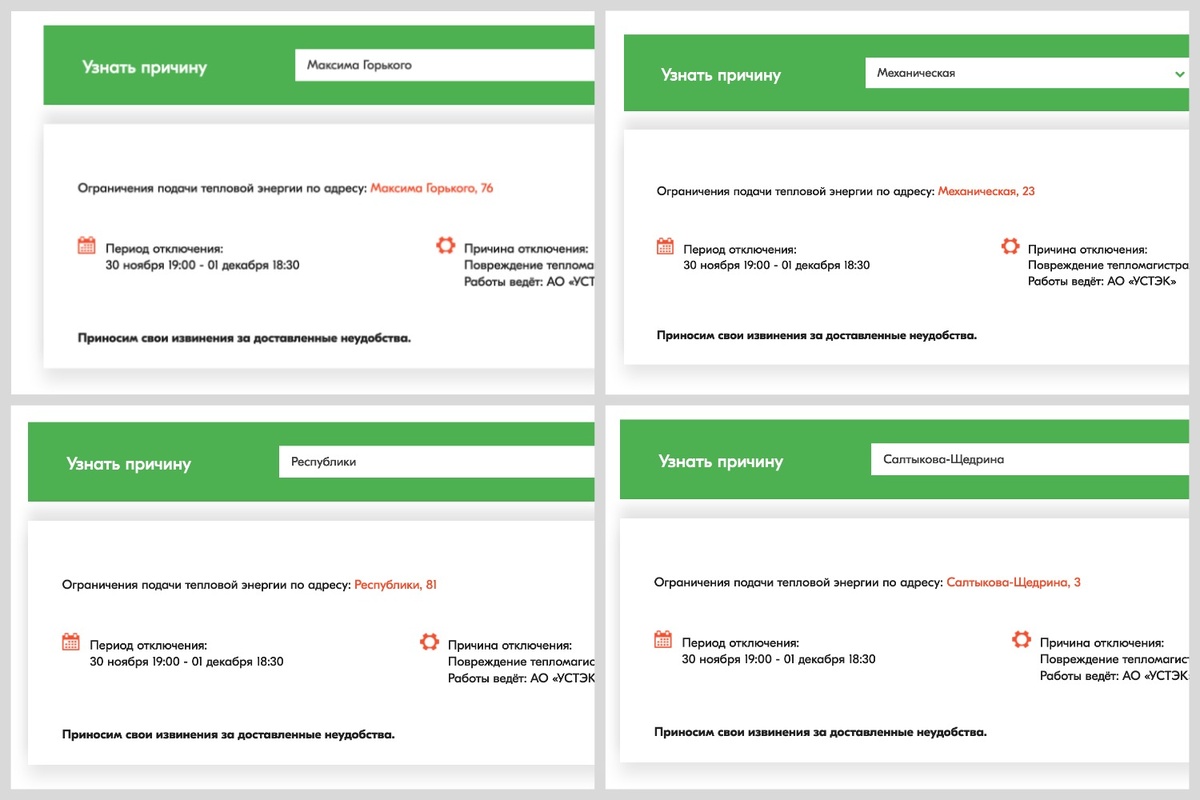 Около сотни жителей Тюмени остались без тепла почти на сутки из-за аварии на теплотрассе «УСТЭК» Крупная авария на магистральных тепловых сетях в центре Тюмени привела к прекращению подачи отопления и горячего водоснабжения в многоквартирные жилые дома. По предварительным оценкам, перебои могли затронуть порядка 80 домовладений, расположенных приблизительно на десяти улицах в центральной части города. Согласно официальным данным компании «УСТЭК», повреждение на трубопроводе было зафиксировано вечером 30 ноября около 19:00 в районе торгового центра «Гудвин». По информации из социальных сетей и обращений жителей, без тепла и горячей воды остались дома на улицах Николая Машарова, Республики, Максима Горького, Холодильной, Фабричной, Механической, Минской, Малыгина, Энергетиков, Салтыкова-Щедрина и других. Ресурсоснабжающая организация сообщила, что восстановить подачу ресурсов планируется лишь к вечеру следующего дня, 1 декабря, ориентировочно к 18:30. Такой продолжительный срок устран
