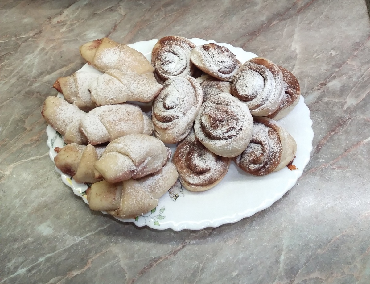 Всем привет. Понедельник выдался кулинарный. Погода мрачная и непонятно, то ли утро, то ли вечер. Зиму не люблю, но хочется снега, чтобы поярче было, а то совсем грустно. С утра занялась приготовлением теста на пиццу. Хотела приготовить пиццу с той колбасой, которую вчера купила. Сделала тесто для пиццы. Рецепт нашла в интернете на каком-то кулинарном канале. Сейчас уже не помню на каком: 250 мл воды 10 гр сухих дрожжей 5 гр соли 10 гр сахара 400 гр муки. Тесто для пиццы и для не сладкой выпечки отличное. Но дочка меня отговорила. Дома нет помидоров и томатного кетчупа. Купить, конечно, не проблема, но решили пиццу не печь, а колбасу съесть так на бутерброды. Была мысль заморозить тесто, но потом решила испечь сладкие булки. Из половины теста налепила рогаликов с малиновым джемом, а из второй половины булочек с сахаром и корицей. С моей духовкой вся выпечка получается бледная. Она пропекается, но верх не зарумянивается. Иногда я переворачиваю пирожки, но сладкие булки не ста