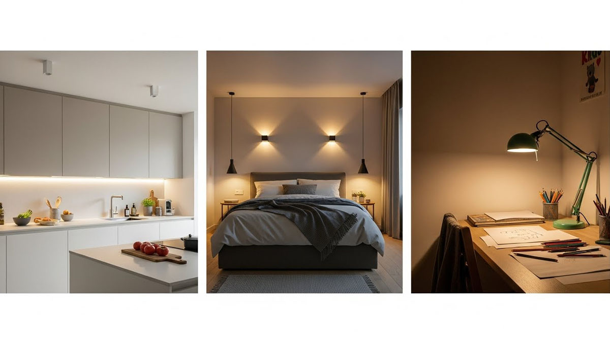 Почему на кухне «чётко», в спальне «спокойно», а в детской — либо «офис», либо тьма? Секрет — в тоне белого света и его распределении. Кухня: общий свет нейтральный, рабочие зоны — собраннее, один тон в сцене, без «мёда с льдом». Спальня: тёплый, мягкий свет + диммер. Блики и «синь» убираем — мозгу проще переключиться на отдых. Детская: тёплый общий фон + локальная настольная лампа нейтральнее для занятий. Единый оттенок, без разнотона. Плюс: там, где важны кожа, еда, бумага и ткани — честная цветопередача (CRI) решает больше, чем ватт-эквиваленты на коробке. Хочется готовых ориентиров, типичных ошибок и быстрых рецептов по комнатам?