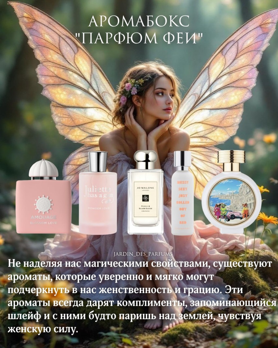 Аромабокс "Парфюм феи" Amouage Blossom Love Juliette Has A Gun Powder Love Jo Malone Peony & Blush Suede What We Do Is Secret Messy Sexy Just Rolled Out Of Bed Haute Fragrance Company Dazzling Girls