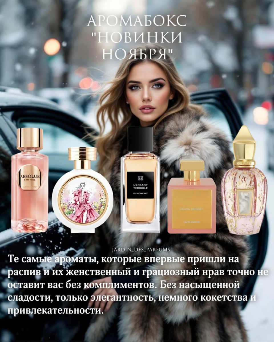 Аромабокс "Новинки ноября" Givenchy L'Enfant Terrible Haute Fragrance Company Forbidden Whisper Lancome Absolue 6 AM Rose Xerjoff Elle Anniversary House Of Brandt Guava Sorbet