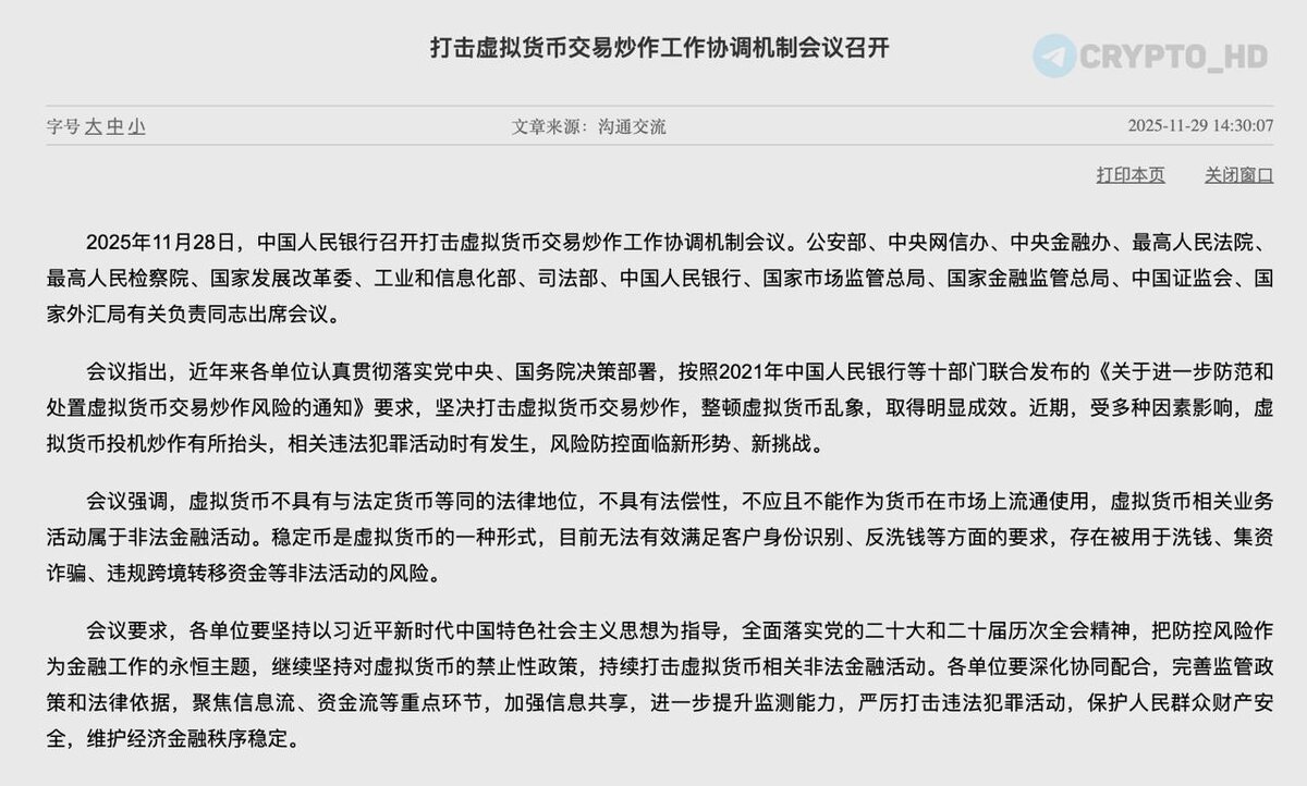 🇨🇳 В Китае снова ужесточают политику против криптовалюты. Народный банк Китая провел экстренное совещание по всплеску спекуляций на рынке виртуальных активов. Власти заявили: • Криптовалюты не имеют статуса денег и не могут использоваться в расчетах. • Все операции с ними считаются незаконной финансовой деятельностью. • Стейблкоины признаны формой виртуальной валюты, которая не соответствует требованиям KYC/AML и несет риски отмывания денег, мошенничества и нелегального вывода капитала. • Правоохранительные органы фиксируют новый рост преступлений, связанных с криптой. Ведомствам поручено усилить мониторинг, объединить данные по потокам информации и денег, а также жестко пресекать любые незаконные схемы. Ранее: - блокчейн в морской торговле - Китай обвиняет США в краже BTC - Китай в криптоиндустрии - приостановка криптоинициатив - снимут запрет на крипту? Crypto Headlines
