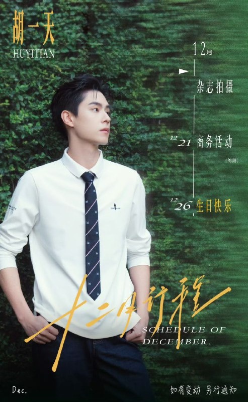 Своим расписанием на декабрь поделился Ху Итянь, у которого 26 декабря будет день рождения: