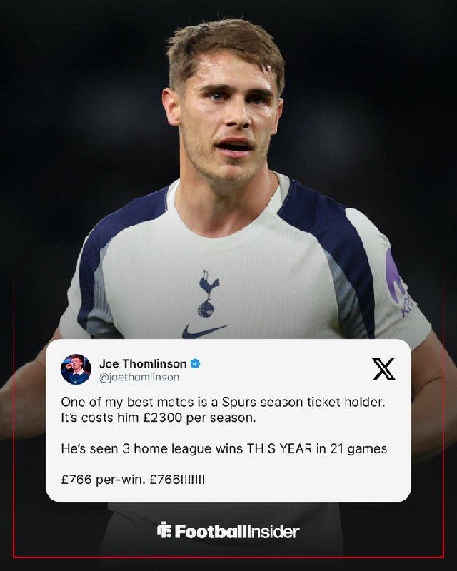 Фанат "Тоттенхэма" купил абонемент за 2300 фунтов и в этом году увидел только три домашние победы в 21 сыгранном матче. Цена победы — 766 фунтов 💰