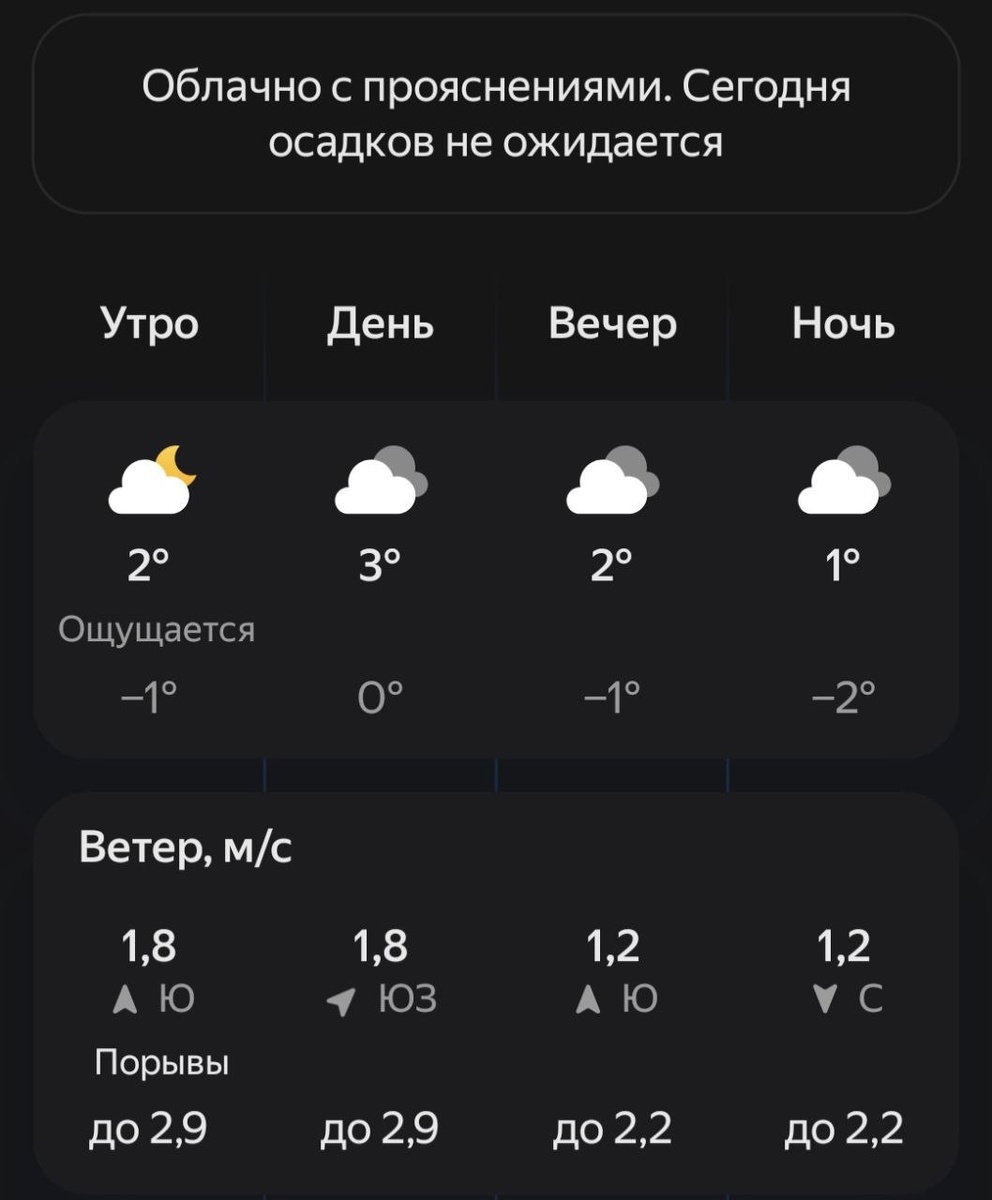 Ожидается слабый ветер, 1 м/с с порывами до 3 м/с.