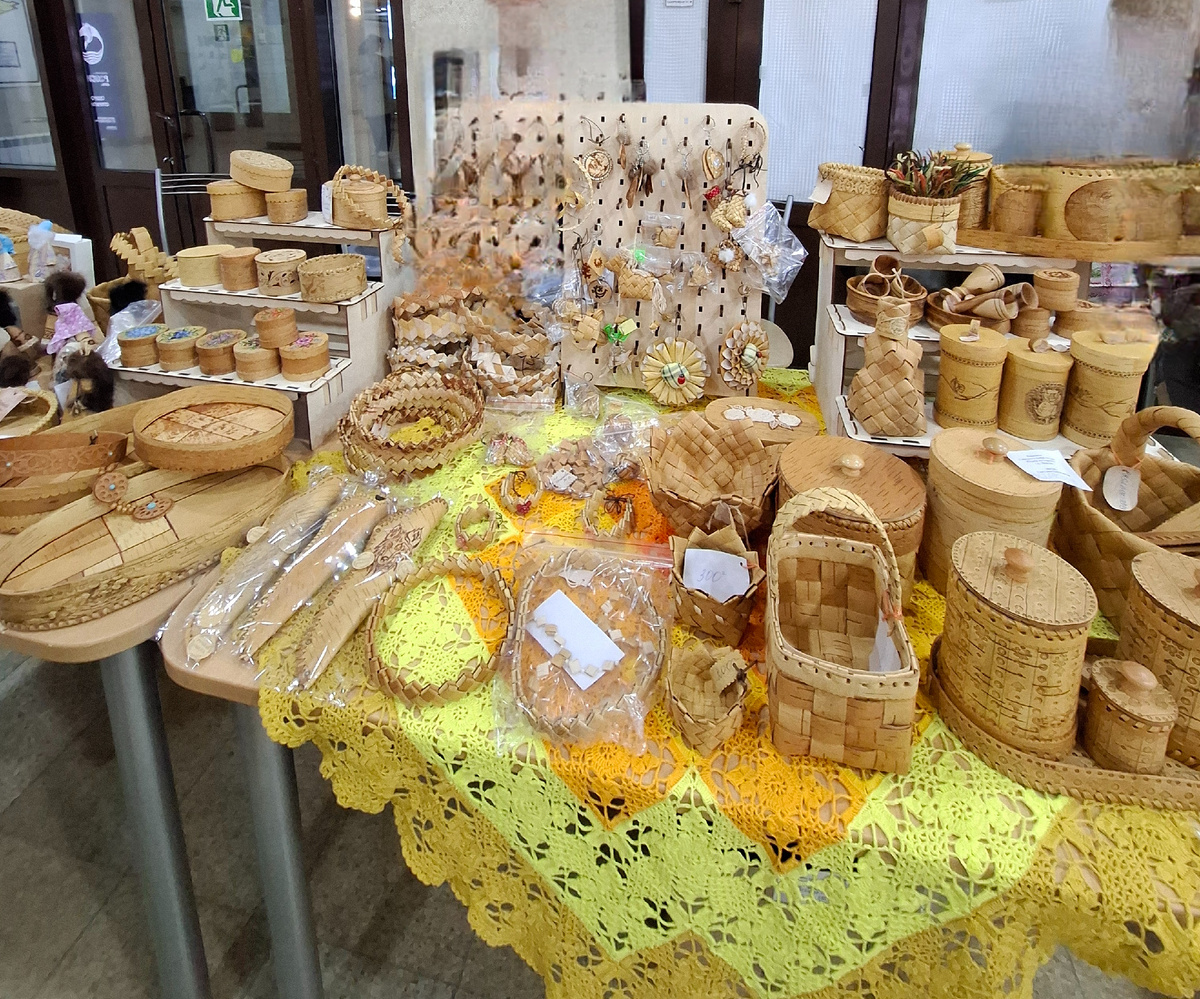 Приветствую читающих. В одно из воскресений, ездили в районный Дом Культуры , были мероприятия ко Дню Матери и конечно торговля. Ассортимент увеличивается, растет и качество. Для ярмарок приобрели стенды, так прилично выглядит наше торговое место. Скатерть вязала в совместнике со Светланой ( канал " Дурушка вяжет. Живу.Люблю) , даже и не думала , что пригодится в таком необычном месте. Цвет очень подходит к бересте. Все ярко и солнечно, даже если на улице пасмурно. Не нравится мне стоять за прилавком. Не торговый работник. Хотя в школе 9-10 класс у нас был курс профориентации. В те прекрасные времена все было не так сложно. Проходила практику в магазине, мама работала там, еще с того времени поняла, что я не буду продавцом. За прилавок работницы меня просто выталкивали, учили и подшучивали надо мной. Позировала только для фото, потом сразу сбежала. Мероприятие районного масштаба всегда снимают для местного телевидения.А я стояла и снимала оператора, как он снимает