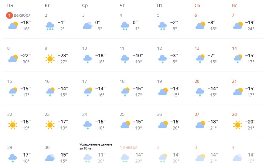 Декабрь в Красноярске начался с морозов — столбики термометров показывали -26°С с утра. Будет ли весь месяц холодный или в город придёт потепление — в прогнозе от «Города Прима». Сайт «Яндекс. Погода» говорит, что весь месяц будет переменчивая погода. Столбики термометров будут скакать от -3°С до -30°С. Так, в первую неделю декабря после морозных выходных придёт резкое потепление — температура поднимется до нуля градусов днём. В выходные вновь похолодает до -20°С. Вторая неделя вновь будет переменчивая: от -3°С днём до -30°С по ночам. Однако вторая половина месяца будет стабильной. Столбики термометров будут показывать около -20°С до конца декабря. Отметим, что снег будет идти в основном в середине месяца. По данным сервиса world-weather, первая часть месяца будет переменчивой. Так, в четверг, 4 декабря, будет около -1°С, а в воскресенье похолодает до -21°С. Затем температура будет скакать от -11°С до -28°С. Во второй половине месяца синоптики обещают тёплую зиму. В Красноярске будет о