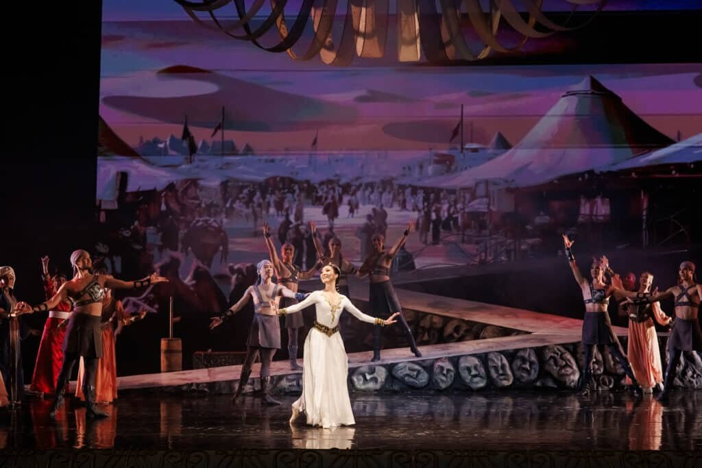 В последние выходные ноября прошла премьера балета «Ұлы Жібек Жолы». Это единственная новая постановка Казахского национального театра оперы и балета имени Абая в 2025 году. Kursiv LifeStyle сходил на премьеру и увидел как переплелись на сцене танцы специй, шахмат, рубинов и путешествие во времени и континенту. КазНТОБ имени Абая (ранее — ГАТОБ — прим.ред) не часто радует премьерами в последние годы. Последняя была ровно год назад, когда алматинцам показали оперу «Хан Султан. Алтын Орда» на музыку Хамита Шангалиева. Теперь пришла очередь и балета, труппу которого практически полностью задействовали в новом спектакле. Идея спектакля, либретто и хореография принадлежит народной артистке Казахстана,руководителю балетной труппы КазНТОБ имени Абая Гульжан Туткибаевой. Сюжет начинается в далеком будущем, жители которого ведут себя отчужденно из-за тотальной цифровизации. Главный герой — юноша, переносится в прошлое и оказывается во времена расцвета Великого Шелкового пути, то есть до начала