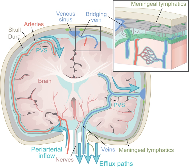 Жидкость, собирающая метаболические отходы, покидает мозг несколькими путями: через перивенозные пространства, вдоль черепных и спинномозговых нервов, а также через так называемые ACE-точки(arachnoid cuff exit/entrance) – специализированные структуры вокруг мостиковых вен. Оттуда отходы попадают в менингеальные лимфатические сосуды твердой мозговой оболочки, которые транспортируют их к шейным лимфатическим узлам.