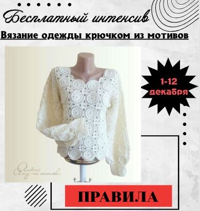 ✅Как будет проходить бесплатный интенсив. Дорогие мастерицы! Прежде чем мы отправимся в увлекательное путешествие по созданию идеальных мотивов, давайте ознакомимся с правилами интенсива. Пожалуйста, прочтите внимательно! 📌 Правила нашего вязального приключения: 😔Интенсив включает первые 6 уроков из полного курса "Вязание одежды крючком из мотивов». 😔Они будут публиковаться здесь, в канале. Полный курс состоит из 45+ уроков и проходит на удобной обучающей платформе. 😔Новые уроки будут появляться в 20:00 по московскому времени. Это время выбрано с учетом разных часовых поясов. На выполнение каждого задания у вас будет 48 часов (кроме первого - на него даю 24 часа). 😔Ваши готовые работы нужно выкладывать в комментариях к соответствующему уроку до выхода следующего. 😔За каждое выполненное в срок задание вы будете получать нашу внутреннюю валюту - "ажурики". Их можно будет использовать для приобретения полного курса. За каждое задание вы получаете 350 ажуриков (эквивалент 350