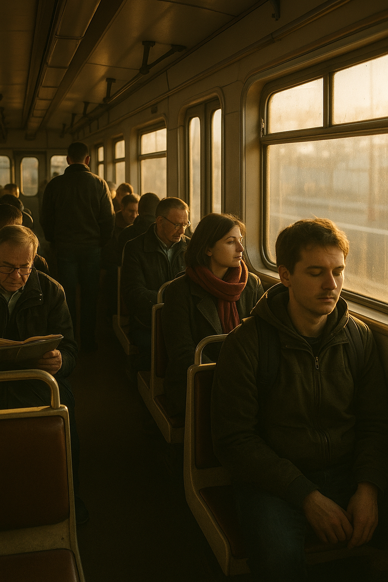 Ещё одна деталь утренних поездок - взгляд. Люди стараются не встречаться глазами, как будто это лишняя вовлечённость. Но иногда всё равно ловят друг друга на этих быстрых пересечениях. Удивительное ощущение: на секунду жизнь одного человека соприкасается с жизнью другого, и в этом коротком контакте видно усталость, надежду, раздражение, смешок. Потом каждый снова уходит в свои дела, но общее поле на пару мгновений становится чуть живее.