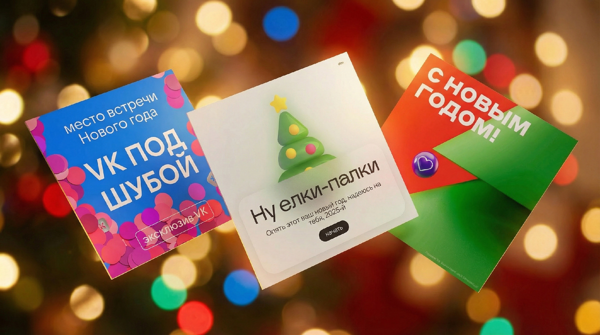 Для этого забываем про гирлянды рамки и ледяные фоны и выходим из магазина штампов. Вместо этого работаем с настроением: градиентами, светом, крупными деталями и одной сильной идеей. Главное — выделиться лаконичностью и вкусом, а не избыточностью. Не используйте гирлянды в качестве рамок и статичные композиции с елками; Исключите ледяные текстуры на фоне, это создает только шум и мешает читать текст; Убирайте свитера и зарубежные «праздничные» клише (носки, олени, забавный Санта на санях или в дымоходе — все это не про наш контекст); Красно-зеленые сочетания уже сами по себе создают настроение, не перегружайте макет рисунками и узорами; Откажитесь от стандартных промтов, копируемых без мыслей, и от миниатюр с человечками и цифрами — такой подход не выделяет вашу работу. Не используем каллиграфические «фотостоковые» надписи. Либо рисуем свою уникальную надпись или используем корпоративный шрифт. Не используйте то, что было актуально каждый Новый год в последние 5-10 лет. Ваш макет д