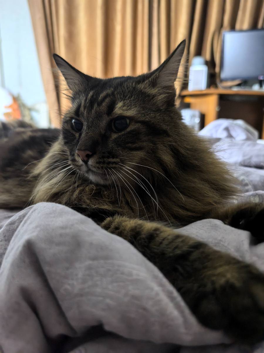 Всем привет! С вами Кузя Кусалочкин (он же царь Кузьма I). Сегодня расскажу, как я классно проводил день, какой замечательный был у меня вечер, а ещё про птичек и девочку. Утро началось с пасмурной погоды. О том, что я будил хозяйку раньше 5 утра и потом в 7 часов пришёл за паштетиком, вы уже знаете. Ничего, встала хозяйка. Говорит, правда, что не выспалась, но это не страшно. На новые каналы я сейчас не подписываюсь. Дружить, забежать в гости времени нет. Съел паштетик и ушёл лежать на кровати: С такой пасмурной погодой очень хотелось спать. Поэтому весь день я спал. То на диванчике, то на кровати посплю. Тут вот рядом с халатом прилёг. Хозяйка днём опять куда-то уходила. Потом вернулась, и они с хозяином сели сериал смотреть. Ну и я к ним пришёл развлекаться. Кстати, у нас ещё вечером дождь пошёл, довольно сильный. Сначала я просто лежал с хозяином, он меня чесал, гладил. А потом решил сделать кусь: И нет, не потому, что мне надоели действия хозяина, а просто захотелось укусить.