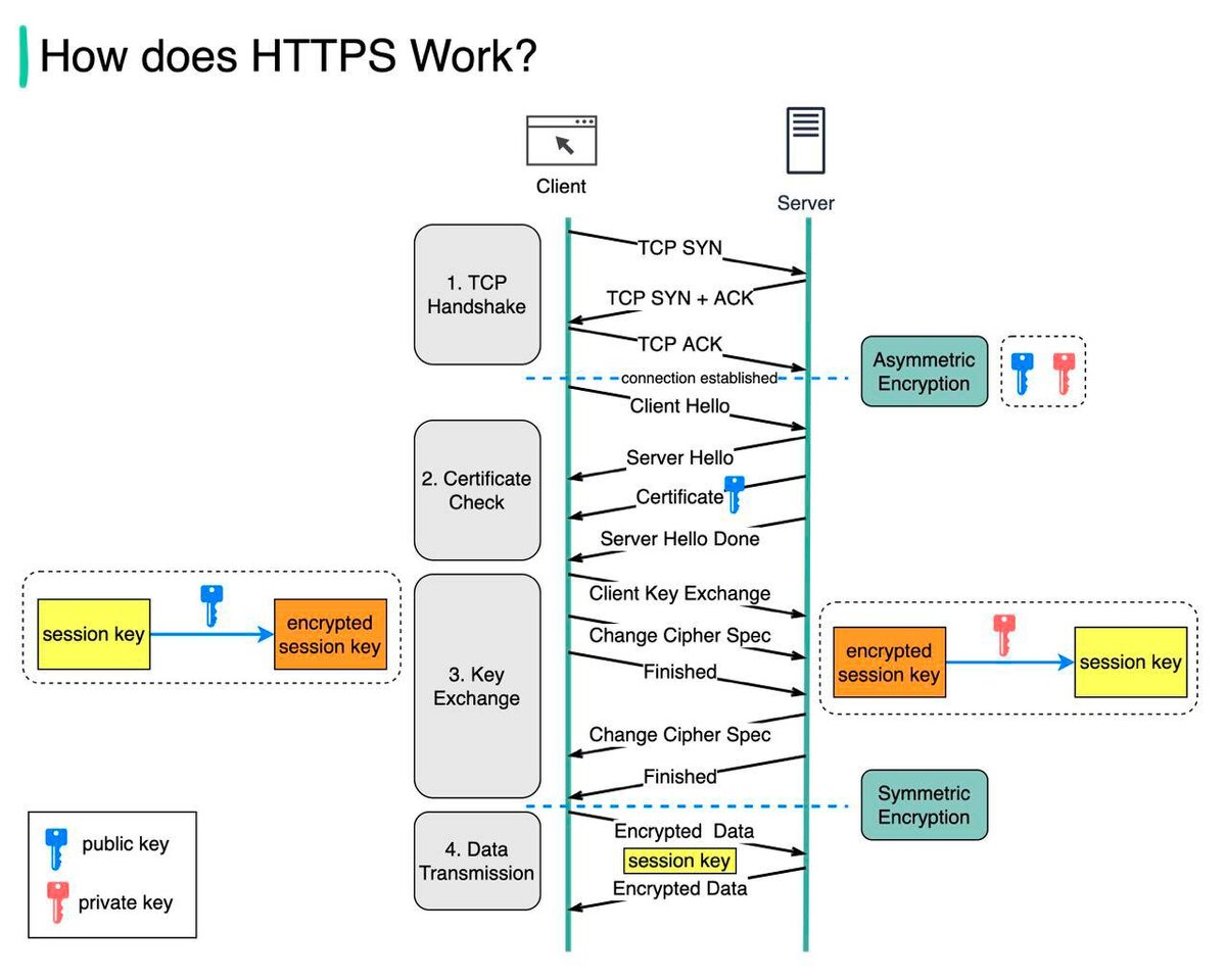 Безопасный протокол передачи гипертекста (HTTPS) - это расширение протокола передачи гипертекста (HTTP). HTTPS передает зашифрованные данные с использованием транспортного уровня безопасности (TLS). Если данные будут перехвачены в Интернете, все, что получит угонщик, - это двоичный код. Как шифруются и дешифруются данные? Шаг 1 - Клиент (браузер) и сервер устанавливают TCP-соединение. Шаг 2 - Клиент отправляет серверу " client hello". Сообщение содержит набор необходимых алгоритмов шифрования (наборов шифров) и последнюю версию TLS, которую он может поддерживать. Сервер отвечает " server hello", чтобы браузер знал, может ли он поддерживать алгоритмы и версию TLS. Затем сервер отправляет SSL-сертификат клиенту. Сертификат содержит открытый ключ, имя хоста, дату истечения срока действия и т. д. Клиент проверяет сертификат. Шаг 3. После проверки SSL-сертификата клиент генерирует ключ сессии и шифрует его с помощью открытого ключа. Сервер получает зашифрованный ключ сеанса и расшифр