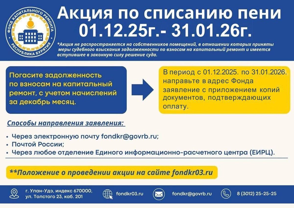 Фонд капитального ремонта объявляет акцию по списанию пени С 1 декабря по 31 января жители Бурятии смогут списать начисленные пени по взносам на капитальный ремонт при условии погашения задолженности. Для списания пени необходимо направить в адрес Фонда заявление с приложением копий документов, подтверждающих оплату задолженности. Принять участие в акции могут как физические, так и юридические лица. Заявление с копиями документов, подтверждающих оплату, принимается: • на электронную почту: fondkr@govrb.ru • через Почту России • через любое отделение ЕИРЦ • лично в Фонде по адресу ул. Толстого, 23, каб. 201, с понедельника по четверг с 08:30 до 17:30 и в пятницу с 08:30 до 16:30 (без перерыва на обед). ❗️Акция не распространяется на собственников помещений, в отношении которых уже приняты меры судебного взыскания задолженности по взносам на капитальный ремонт и имеется вступившее в законную силу решение суда.
