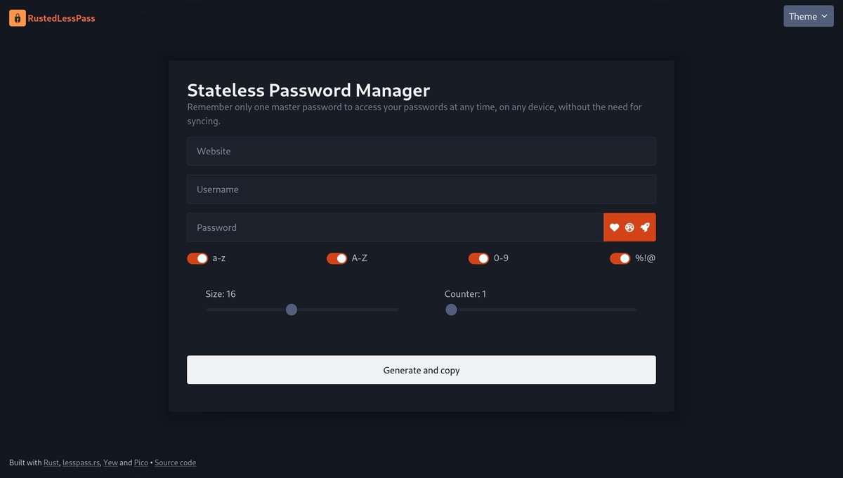 RustedLessPass — это автономный менеджер паролей, написанный на Rust и работающий на Rust / Wasm. Устали возиться со слабыми паролями? RustedLessPass помогает удобно и безопасно управлять вашими учётными данными. Созданный на Rust и WebAssembly, он обеспечивает независимое от платформ решение для хранения паролей. Основные особенности: Совместимость с LessPass: Привычный и понятный интерфейс. Мощь WebAssembly: Запускается прямо в браузере без серверной части — все данные остаются под вашим контролем. Кроссплатформенность: Управляйте паролями с любого устройства с современным браузером, независимо от ОС. Открытый исходный код: Прозрачность, безопасность и возможность участия сообщества в разработке и аудите. Берём отсюда : https://github.com/RustedLessPass/RustedLessPass