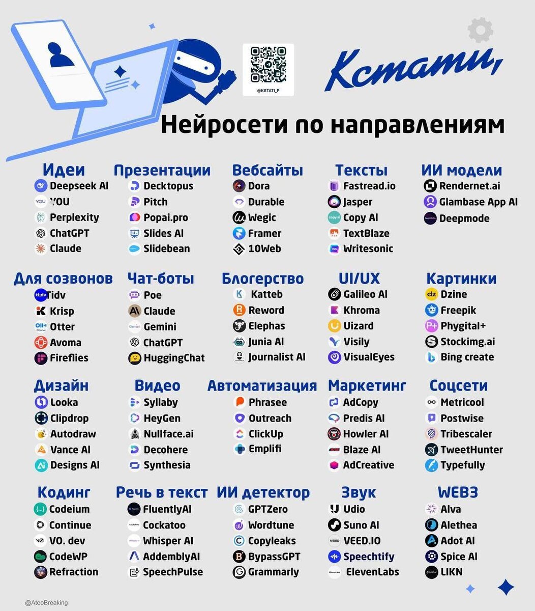 Давно я подборки инструментов на давал вам. Доделывал свой курс по нейросетям для новичков, там вставлял такой список (см. в шапке) и вспомнил, что в канал надо также его повторить. А вдруг вы что-то найдете полезное и среди этих: • krea.ai — рисует логотипы • elevenlabs.io — клонирует голос • suno.ai — сочиняет музыку • runway.ml — редактирует видео • relume.io — собирает сайты • descript.com — чистит звук • fliki.ai — начитывает текст • tome.app — делает презентации • perplexity.ai — ищет лучше Google • picwish.com — чистит фотки • lumalabs.ai — собирает 3D • veo.ai — видео генератор 💯 Перешлите своим знакомым и добавьте в избранное! 🗣Подпишись! Про Бизнес и ИИ 🤖