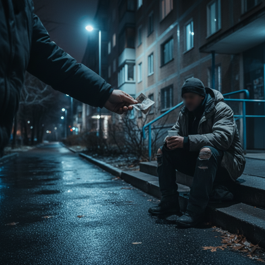 Он сидел на коробке у входа - грязная куртка, щетина, рядом стаканчик. — Помогите, кто чем может, - негромко сказал он, когда я проходил. Я уже прошёл мимо. Потом остановился. Вернулся.