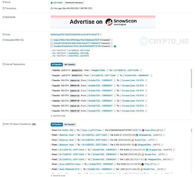 #взлом ❌ Проект Yearn Finance взломан на $9m (PeckShield) Хакер получил возможность создавать (печатать) бесконечное количество #yETH и опустошил пул одной транзакцией. Yearn Finance: Затронутый контракт – кастомная версия stableswap-кода, не связанная с остальными продуктами Yearn Finance. Полное расследование уже ведется, остальные продукты компании находятся в полной безопасности. Crypto Headlines