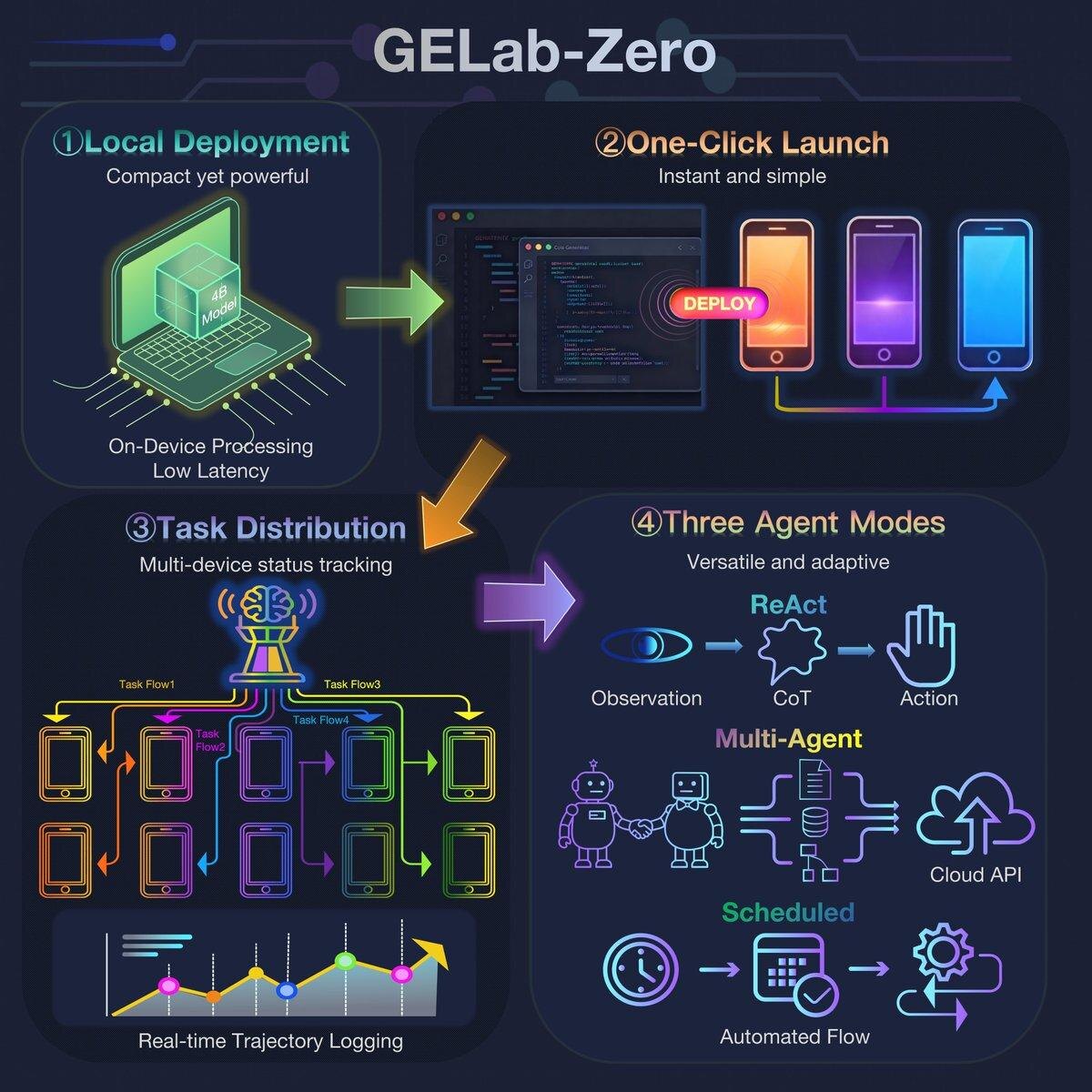 🚀 GELab-Zero - первый полноценный open-source стек “Model + Infra” для GUI-агентов. Это открытая альтернатива закрытым системам уровня GUI Agent MCP: готовая модель, готовая инфраструктура и новый бенчмарк, собранный под реальные задачи. Что внутри: • SOTA-модель 4B - лёгкая, быстрая, запускается локально. • One-Click инфраструктура - без ADB и сложных зависимостей. • AndroidDaily - новый бенчмарк, основанный на рабочих пользовательских сценариях. Производительность: • Лучшие результаты на открытых тестах - модель обходит гораздо более крупные системы вроде GUI-Owl-32B на ScreenSpot, AndroidWorld и OSWorld. • 73.4% точности на AndroidDaily - существенно выше, чем UI-TARS-1.5 (47%), Gemini-2.5-pro-thinking (36.6%) и GPT-4o (19.6%). Идея простая: скачивайте, запускайте локально, ломайте, улучшайте. Открытый стек для GUI-агентов наконец доступен. 🟠HuggingFace: https://huggingface.co/stepfun-ai/GELab-Zero-4B-preview 🟠GitHub: https://github.com/stepfun-ai/gelab-zero 🟠Blog: https: