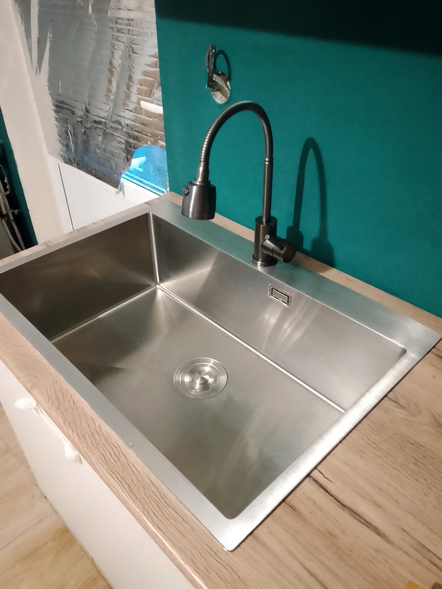 Мойка пришла ещё полторы недели назад, как и кран. А вот столешницу ждали долго. К тому же надо было дождаться выходных, чтоб муж смог распилить, выпилить и установить. А я ещё и место такое выбрала, в 1,5 м от слива и сифон там маленько нестандартный. Так что ещё и сочиняли, как её в слив запустить, да так, чтоб не выносило. Подключение раковины к воде и сливу, это отдельная боль. Но мы справились и даже пережили. В целом, сантехнические процедуры нам даются тяжко. Мать-перемать, но справляемся своими силами.