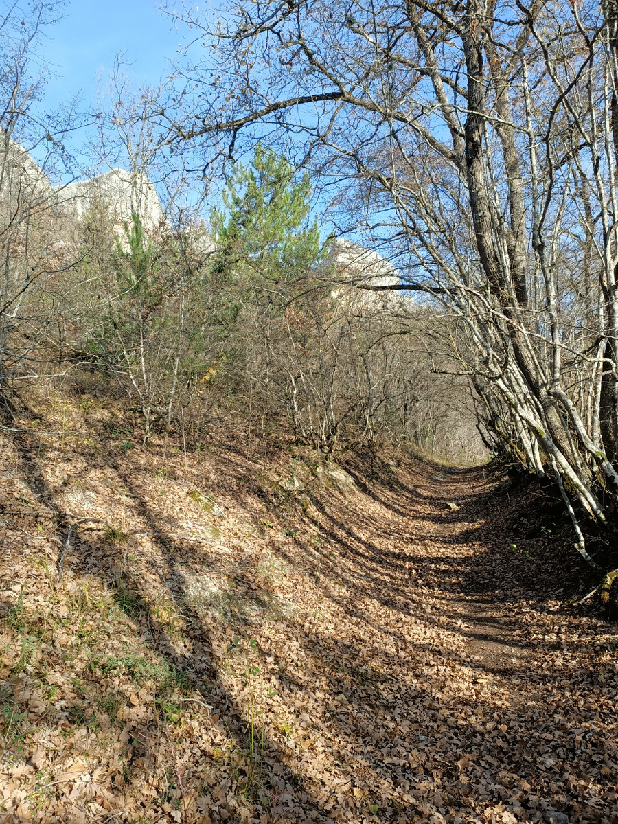 Никогда бы не узнал о 5 балке, если бы не проложил дорогу к двум гротам: - Чуплак-Сырт - Планетарный. О гроте Чулпак-Сырт уже рассказал: Он лежит чуть дальше, чем проложена тропа вдоль 5 балки. А что из себя представляет сама 5 балка? Вдоль крутого подъёма к скалам, которые за многие столетия благодаря дождям и ветрам превратились в вертикальную светло-жёлтую стену, с осыпями огромных валунов у подножия, бежит тропа. Тропа ровная, с ограничением в виде перил, покрытая шуршащей коричневой осенней абсолютно сухой листвой. Солнышко проглядывает сквозь ещё не полностью опавшие листья, ветра нет, тепло, а сверху скалы... Скалы похожие на стены, выстроенные волшебником, чтобы защитить небольшой уголок Крыма от людей... Совсем рядом пещерный город Эски-Кермен, но здесь о нем даже не вспоминаешь, хочется просто идти вперёд и смотреть по сторонам. Скалы... Лес... Где-то наверху Планетарный грот. Снизу его не видно, только по навигатору можно предположить его расположение, надо попытаться