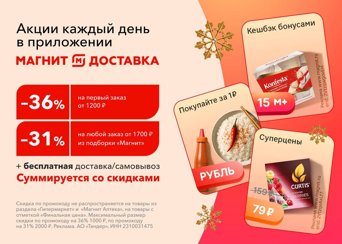 Доброе утро 😃 🧲🧲🧲🧲🧲🧲 🧲🧲🧲🧲🧲🧲🧲🧲 Новые промокоды!! Скидка 🤩🤩💯на покупки самовывозом 🤩 PE1I0KRX – на скидку 36% на первый заказ от 1000 ₽. 🤩 СНЕГ -- на скидку 31% на любой заказ от 1700 ₽ на товары из подборки «Магнит». Бонусы суммируются со скидками. Максимальный размер скидки по промокоду 36% – 1000 ₽, по промокоду на 31% - 2000 ₽. Не распространяются на товары из разделов: «Магнит Косметик», «Аптека» и «Финальная цена». Успевайте! Пока работают промокоды ✅ Подписаться 🔣 Бот с промокодами