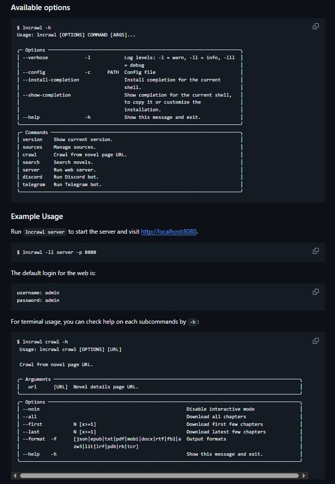 📚 lightnovel-crawler — это инструмент на Python, предназначенный для загрузки новелл из разных онлайн-источников и их объединения в e-book