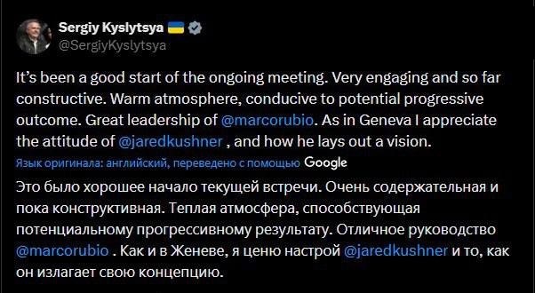 Рубио после встречи с украинцами: - Наша цель здесь это закончить войну, но это больше, чем просто закончить войну. Мы не просто хотим закончить войну, мы также хотим помочь Украине быть в безопасности навсегда. - Это не только об условиях, которые прекращают боевые действия, это также об условиях, которые создают для Украины долгосрочное процветание. - Это деликатно, это сложно, здесь много движущихся частей, и очевидно, здесь задействована другая сторона, которая должна будет стать частью уравнения. - Стив Уиткофф поедет в Москву, но у нас довольно хорошее понимание их взглядов тоже. - Предстоит ещё много работы. - Мы продолжаем реалистично относиться к тому, насколько это сложно, но оптимистично, особенно учитывая тот факт, что по мере того, как мы делаем прогресс. Трамп: - У Украины есть несколько больших проблем. - У них сложилась ситуация с коррупцией, которая не способствует делу. - Я это предвидел еще 3 года назад. ℹ️ С Рубио все понятно, он говорит о прогрессе, хотя США н