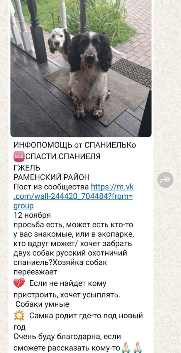 Две породистые собаки (русский охотничий спаниель) со всеми документами, явно приобретены ни за копейки, но даже это никого не смущает и не останавливает… Спасибо, конечно, что предприняты попытки найти ручки, и то распространением инфы больше занимались неравнодушные чем хозяева…