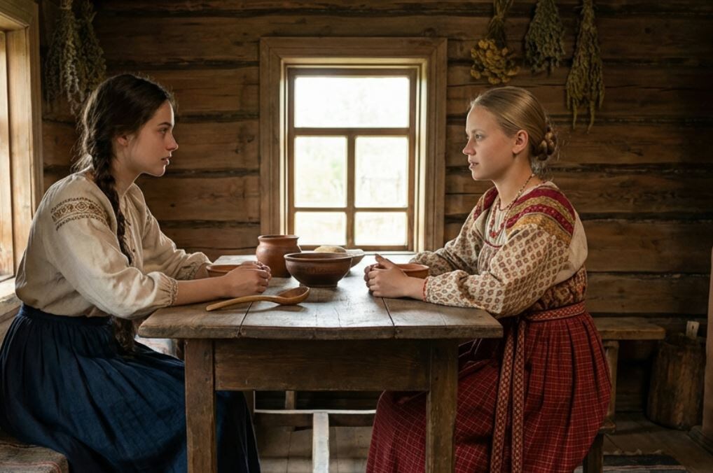 Ольга стояла у подтопка, нагнувшись к чугунку. В печи трещали тонкие лучинки, огонёк едва разгорался. Она покашливала от дыма и старательно подбрасывала щепу, будто это был самый важный труд на свете. В избе было сумрачно, зимний день клонился к вечеру, и огонёк подчёркивал её тонкое лицо, задумчивые глаза.