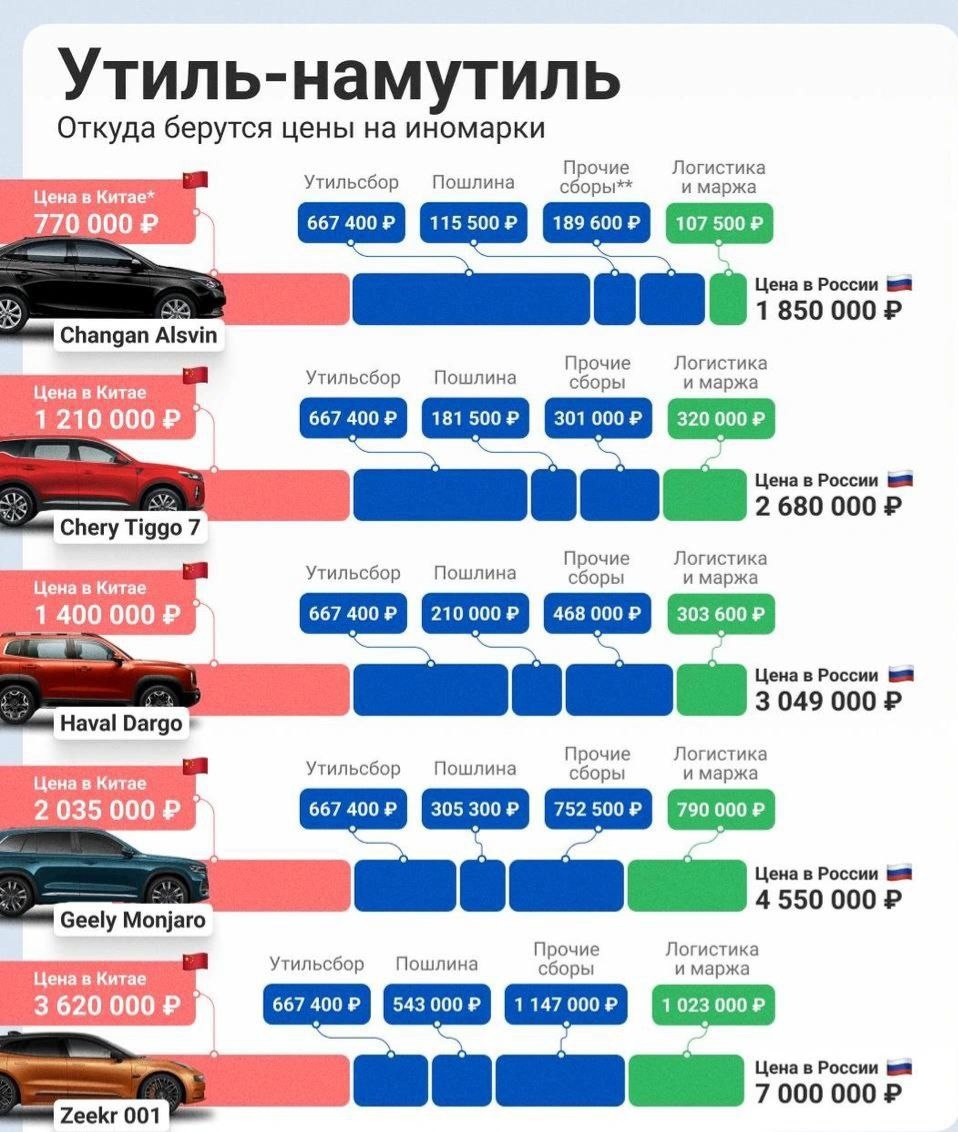 Утиль сбор вступил в силу Хоть и с отсрочкой, но новый утильсбор только что вступил в силу в России: цены на авто с двигателем более 160 л.с. взлетят в 500-1000 раз. Резкое повышение ставок затронет все машины с мощностью двигателя выше 160 л. с. — к этой категории относятся популярные в России модели Kia, Hyundai, Toyota, BMW, Mercedes, а также многие китайские автомобили. Примеры доплат: — Toyota Camry 3,5 от 2,9 млн руб.; — Kia K5 от 795 тыс., — BMW M5 от 4 млн.; — Lixiang L9 почти 2 млн вместо 3,4 тыс. Дальше ещё больше — с 1 января 2026 года утильсбор поднимут ещё на 25%, затем ежегодно на 10–20%, к 2030 году только утильсбор по отдельным моделям превысит 10 млн. Минпромторг утверждает, что изменения не затронут 80% россиян.