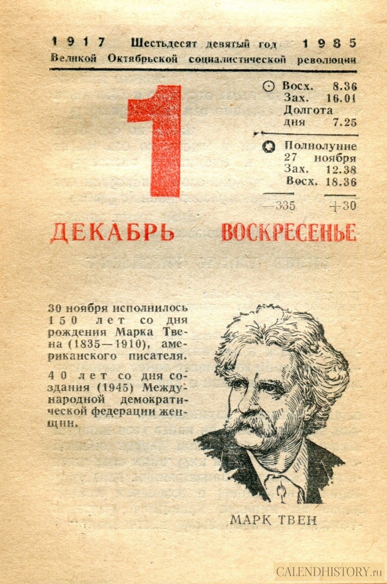 Листок советского отрывного календаря 40-летней давности 1 декабря 1985-го года — Календарь Политиздата 30 ноября исполнилось 150 лет со дня рождения Марка Твена (1835-1910), американского писателя. 40 лет со дня создания (1945) Международной Демократической федерации женщин. Больше советских старых календарей смотрите у нас на сайте - calendhistory.ru https://calendhistory.ru/1-dekabrja-1985-go-goda-kalendar-politizdata/