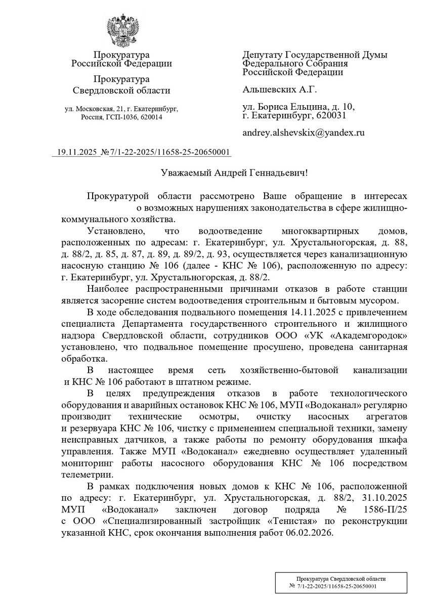 Очередной бедственный сигнал я получил с Хрустальногорской, 88 (Академический район). В своей жалобе жительница с горечью констатировала: разливы сточных вод превратились в печальную обыденность. По ее мнению, одна из проблем – в перегруженности канализационной насосной станции, которая попросту не справляется с объемами. И ответ прокуратуры косвенно подтверждает этот довод. Надзорное ведомство сообщило, что «Водоканал» заказал реконструкцию станции. Работы должны провести в ближайшие месяцы – до 6 февраля.