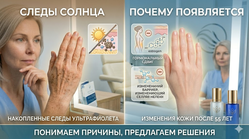 ☀️ Хроническое УФ-воздействие — руки часто остаются без защиты, даже когда лицо укрыто кремом с СПФ;