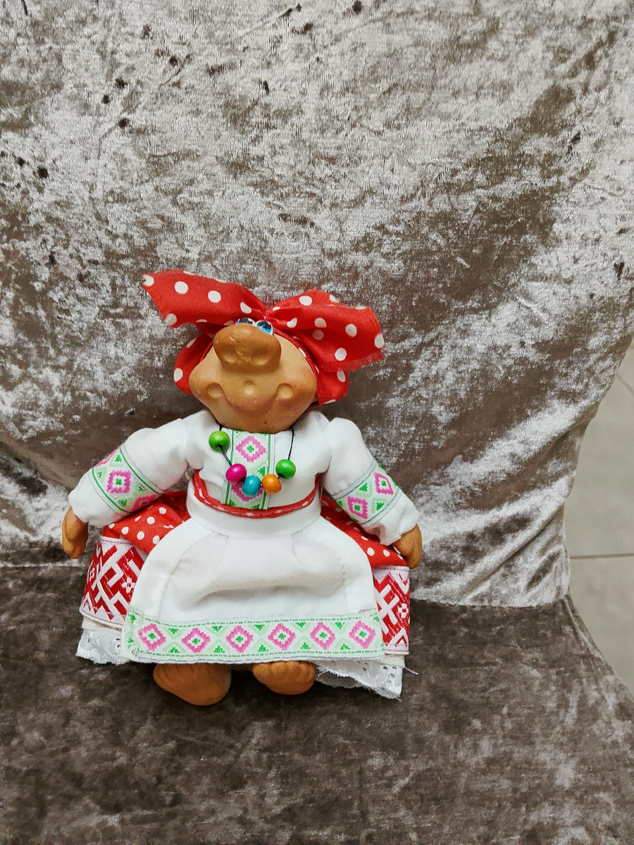 Однажды, отдыхая на нашем любимом Крымском побережье, довелось нам найти на выставке глиняную куклу Солоху в роскошном платье горошком и в таком же деревенском платке, повязанном на хуторской манер-завязочками вперед. Та самая…Гоголевская, настоящая…