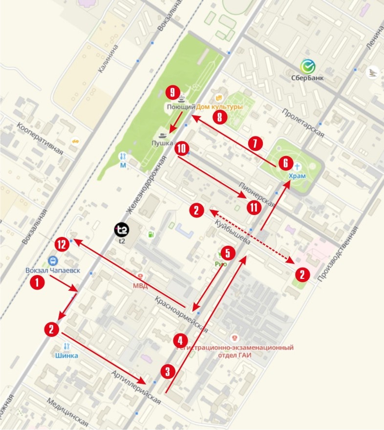 5. Точка для перекуса. На улице Ленина рядом с пересечением с улицей Куйбышева находятся две сетевые пекарни, которые смело могу рекомендовать для посещения. В пристрое торгового центра недавно открылась пекарня-кулинария «Штрудель». Знаю её по Сызрани и Кинелю. В Чапаевске сюда не заходил, но в других городах с удовольствием посещаю. Отличие - большой ассортимент не только выпечки, но и готовых блюд - салатов, гарниров, мясных. Есть свой зал, где можно посидеть. Вторая пекарня - «Дом хлеба», отдельно стоящий павильон ближе к перекрёстку. Оба раза заходил именно сюда. В первый раз, чтобы узнать, чего тут есть. Второй раз - потому что очень понравилось. Зал совсем маленький, всего пара столиков. В ассортименте только выпечка. Вкусная. Особенно некоторые позиции. И там, и там есть чай и кофе. Фото не делал. Придётся верить мне на слово. После перекуса (или перед ним) можно пройтись по улице Куйбышева, чтобы посмотреть памятники, расположенные на ней.