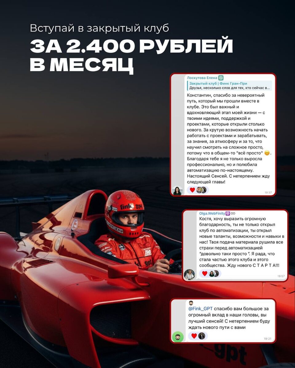 Закрытый клуб «Финк Гран-При» за 2.400₽/месяц В наш клуб можно зайти за 2.400₽ в месяц. Это самый доступный формат участия, который мы когда-либо делали И он открыт для всех Что входит? — Все уроки клуба: Make, n8n, контент-заводы, лидогенерация, агенты, сложные связки, оптимизация, Google-парсинги, TG-автопосты, YouTube-автопостинг, аналитика, интеграции: все 50 уроков — Просмотр без ограничений по времени, в своём темпе — Весь архив блюпринтов и разборов, которые многие внедряют один в один Что не входит? — Обратная связь отсутствует — Новые уроки сейчас не выходят, но, возможно, будут 😉 И я хочу подчеркнуть это честно: мы не обещаем «еженедельные обновления» или «новые связки каждый день» Сейчас клуб — это архив практических автоматизаций, который можно проходить самостоятельно, в удобном ритме. И даже в таком формате люди собирают заказы, запускают свои связки и зарабатывают Почему этот тариф остаётся? Потому что не всем нужна поддержка Многим, особенно новичкам, нужно про