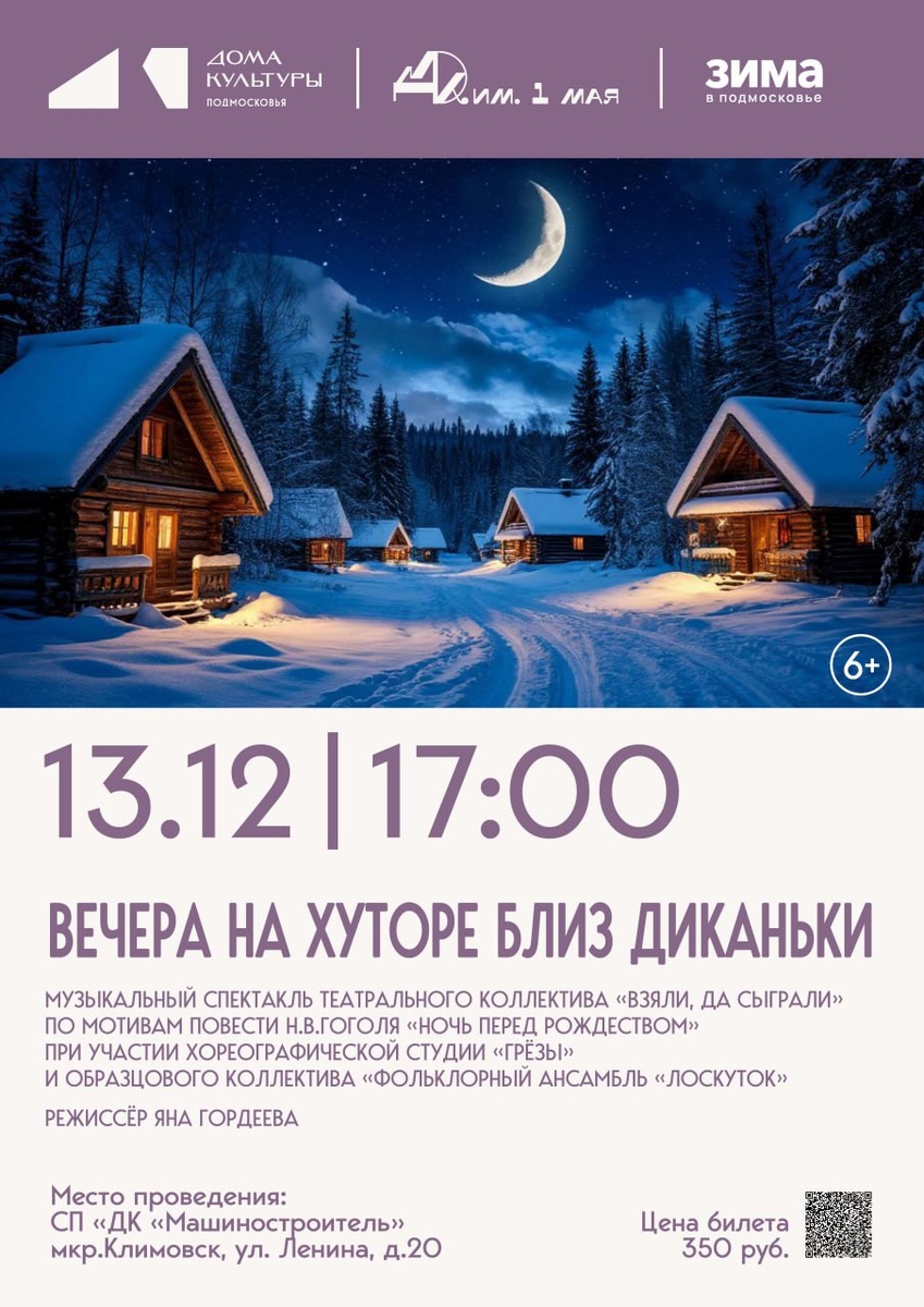 ✨ Музыкальный спектакль "Вечера на хуторе близ Диканьки" 🎭Театральный коллектив "Взяли да сыграли" и представит Вашему вниманию музыкальную сказку при участии хореографической студии "Грёзы" и Образцового коллектива "Фольклорный ансамбль" Лоскуток". 🚫 Возраст: 6+ 📆 13.12.2025 🕒 17:00 🏢 ДК "Машиностроитель" 📍 г.о. Подольск, мкр-Климовск, ул. Ленина, 20 💰 Цена: 350 ₽ ⭐Поддержать канал голосом 🍰Где поесть в Подольске ✅ Мероприятия Подольск https://dzen.ru/id/66ed500f7b5671493eca3fd6 http://vk.com/podolsk_events http://dzen.ru/podolsk_events