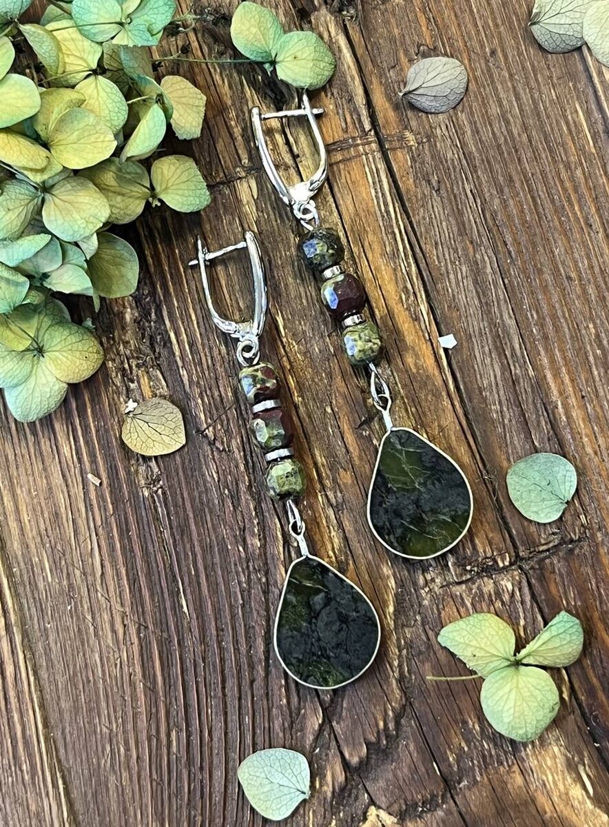Время такое шустрое, всё бежим, бежим… А иногда так хочется замедлиться, слиться с природой и даже слегка «покрыться мхом» 😄 Конечно, это метафора, покрытые мхом Богини хороши если они их мрамора и стоят в красивом старинном парке.. 🌬️ А мы с Вами невозможно прекрасны, юны, и деятельны) некогда нам зеленеть) но разве что украсить себя новыми серьгими в зеленых сложных тонах? Да: здесь у нас лесное сочетание- яшма «кровь дракона» и прекрасномутно зеленые подвески. Ед.экз. Очень. 🌿