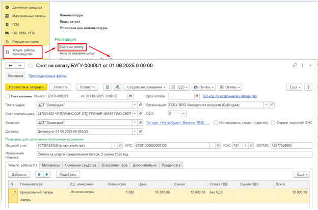 1. Создание документа «Счет на оплату» Чтобы выставить счет на оплату покупателю, создайте документ «Счет на оплату». Найти его можно в разделе «Услуги, работы, производство» → «Реализация» → команда «Счета на оплату». Этот документ формирует печатную форму счета на оплату и не формирует бухгалтерских записей. 2. Печать счета Чтобы сформировать печатную форму нажмите кнопку «Печать» и выберите нужный вариант: · Счет на оплату — стандартная форма. · Счет на оплату (с QR-кодом) — форма с QR-кодом для удобства оплаты через Сбербанк. 3. Заполнение реквизитов получателя Платежные реквизиты получателя, выводимые в печатной форме, заполняются в верхней части формы документа «Счет на оплату» в группе полей «Реквизиты для заполнения платежного поручения». · Лицевой счет: Выберите из справочника «Реквизиты лицевых счетов» счет организации, куда нужно перевести деньги. · КПС: Укажите классификационный признак счета из справочника КПС. · КЭК: Выберите код экономической классификации из справоч