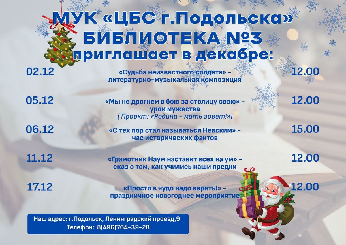 ✨ Библиотека номер 3 публикует свою ашифу на декабрь месяц 🏢 Библиотека № 3 📍 г. Подольск, Ленинградский проезд, д.9 (офис 1) 💰 Вход свободный❗️ ⭐Поддержать канал голосом 🍰Где поесть в Подольске ✅ Мероприятия Подольск https://dzen.ru/id/66ed500f7b5671493eca3fd6 http://vk.com/podolsk_events http://dzen.ru/podolsk_events