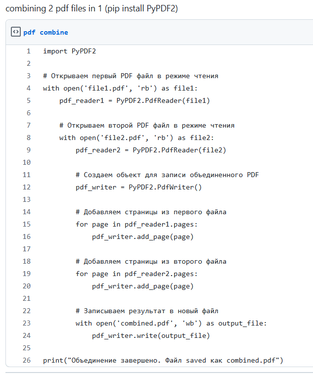 Если вы не хотите скачивать приложение для работы с pdf или покупать его, а данные в ваших файлах слишком важные, чтобы загружать их в сеть и объединять онлайн, то можно воспользоваться простым скриптом. Код на питоне позволит вам объединить файлы на стационарном устройстве (не обязательно, что это будет компьютер, можно сделать это и на телефоне, и на планшете, если у вас установлены программы для работы на питоне). Если нужно объединить больше двух файлов — просто добавьте их в список и используйте цикл для их добавления. Не забываем установить библиотеку: pip install PyPDF2 -----------> Код на гитхабе: Посмотреть картинку, как выглядит код, можно здесь ))) У меня сработало хорошо. Всем добра)))