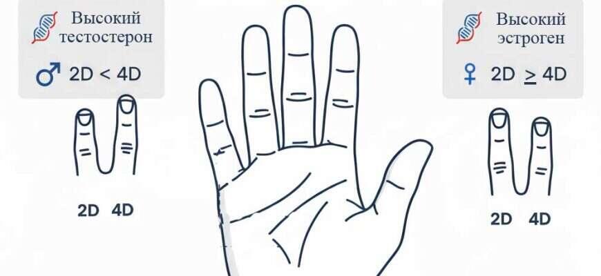 В последние годы в англоязычном сегменте Интернета и некоторых СМИ активно обсуждается простой «тест на пальцах» (или «пальцевый тест»), который, как утверждается, может помочь выявить предрасположенность к некоторым видам рака. Суть этого теста заключается в сравнении длины указательного (2D) и безымянного (4D) пальцев на руке. Идея, лежащая в основе этого теста, связана с воздействием половых гормонов — тестостерона и эстрогена — на плод в утробе матери. Считается, что соотношение длины указательного и безымянного пальцев (соотношение 2D:4D) формируется под влиянием концентрации этих гормонов в период развития. Высокое воздействие тестостерона в эмбриональном периоде коррелирует с более коротким указательным пальцем по сравнению с безымянным (т.е. 2D < 4D). Вам может быть интересно: