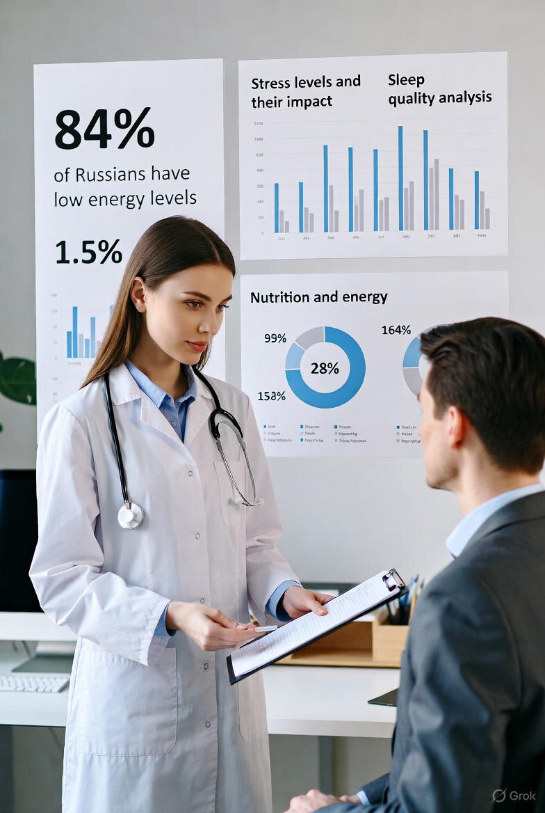 Эту фразу я слышу почти каждый день. И это уже не отдельные случаи — это эпидемия. В 2024–2025 годах мы опросили 8 647 пациентов Clean Clinic (возраст 25–65 лет, все регионы России). Результаты: Цифры совпадают с мировыми: по данным ВОЗ хроническая усталость уже в топ-10 причин обращений к врачам по всему миру, а исследование Gallup 2024 показало, что только 15% людей в развитых странах чувствуют себя «полными энергии» в обычный день. 84% россиян начинают день с энергией ниже 6 из 10 не потому, что «возраст» или «такая работа», а потому что есть конкретные, измеряемые и исправляемые нарушения. Современная медицина позволяет большинству людей поднять энергию с 4–5 до 8–9 баллов за 2–4 месяца б