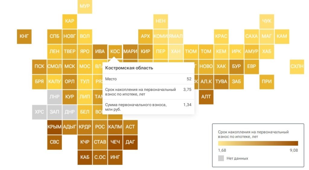 Стартовый платеж в регионе составляет более миллиона рублей, стало известно Logos44.ru. Костромская область занимает 52 место в рейтинге регионов по сроку накопления на первоначальный взнос по ипотеке. Исследование публикуют РИА Новости. По данным издания, чтобы накопить на первый платеж, костромичам нужно почти 4 года. А сумма взноса составляет более 1,3 миллиона рублей. Для сравнения, соседняя Ярославская область занимает в рейтинге 33 место.Там жители способны накопить на первоначальный взнос чуть больше чем за три года. Ивановская область на 70 строчке. Люди откладывают на ипотеку почти 4,5 года. При составлении рейтинга исследователи пользовались схемой, при которой семья с ребенком, где оба родителя работают, откладывает в месяц 50% от своих доходов.
