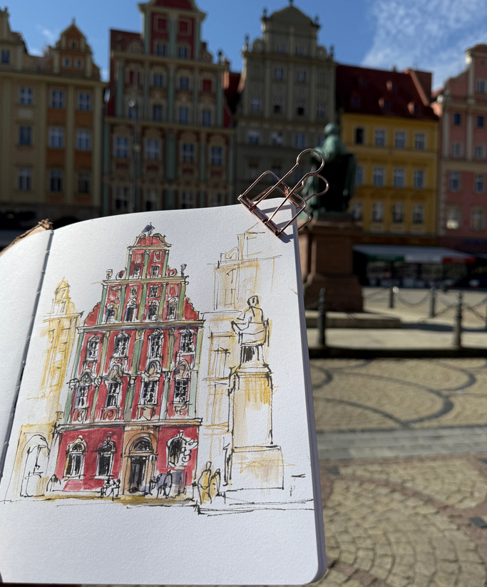 Было очень приятно провести несколько дней в пути после симпозиума Urban Sketchers в Познани. Мы не только много рисовали вместе, но и много часов говорили об искусстве и преподавании. Обсудили широкий спектр художественных концепций и начали пересматривать нашу работу в конце каждого эскиза. Это было очень особенное время! Первой остановкой был Вроцлав. У нас было только две ночи там - один