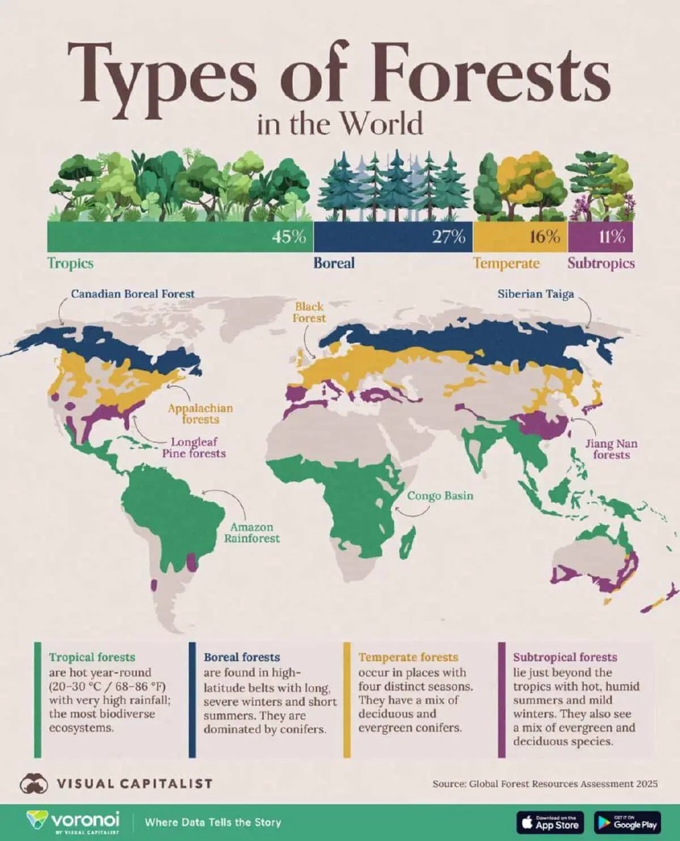 ФАО представила яркую карту мировых лесов в Лесном отчете 2025 ФАО в Лесном отчете 2025 представила карту мировых лесов, выделяя 4 типа: бореальные, умеренные, субтропические и тропические. Тропические леса (45%) являются центрами биоразнообразия и хранилищами углерода, но подвергаются антропогенному давлению (например, в Бразилии с 2015 года потеряно 2,9 млн акров). 29% лесов используются для производства, 36% имеют охранный или смешанный статус, выполняя важные экологические функции. 🗞 Подробнее: infovzor.ru 📷 Изображение: naked-science.ru 🔔 Мы ждем вас: infvzor