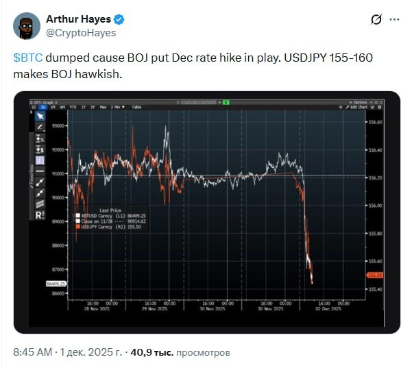 BTC просел, потому что Банк Японии (BOJ) ввел в игру повышение ставки в декабре. Курс USDJPY в диапазоне 155-160 делает BOJ ястребом.